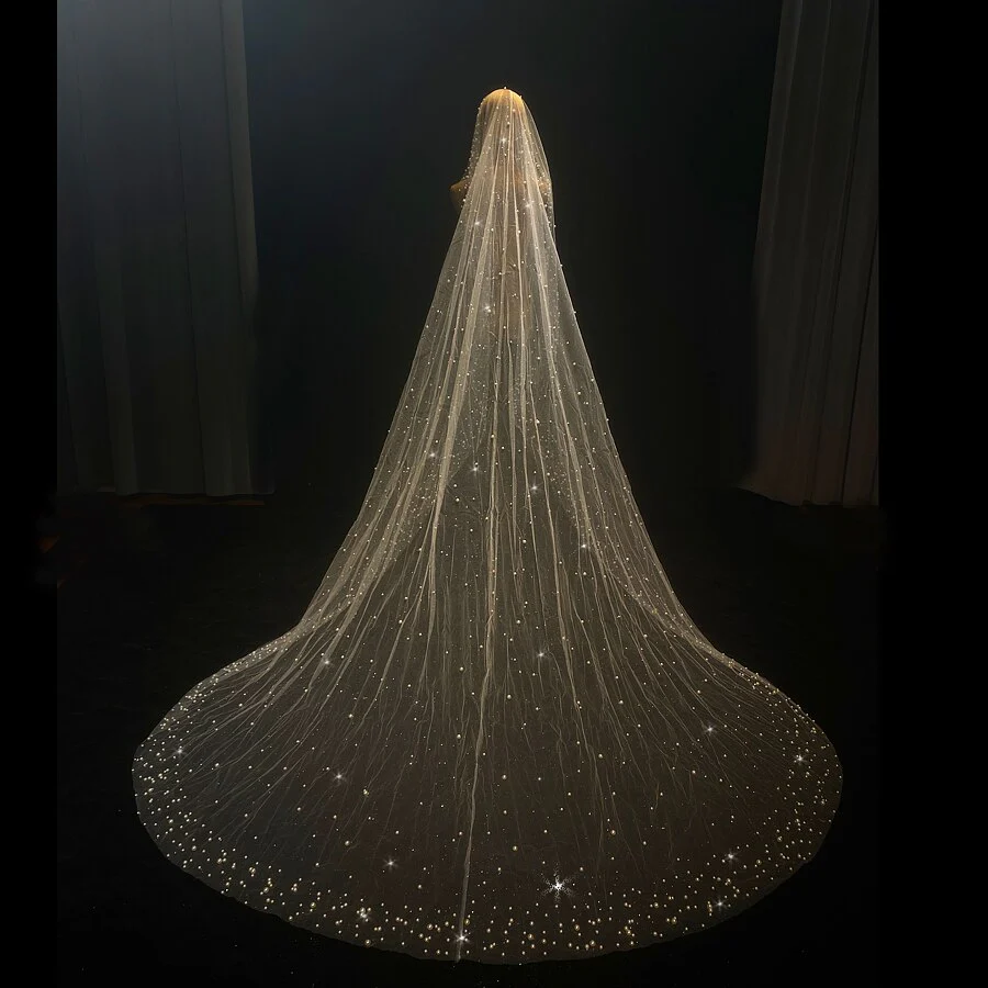 Long 400cm shinny pearls wedding veil with glittler tulle with comb